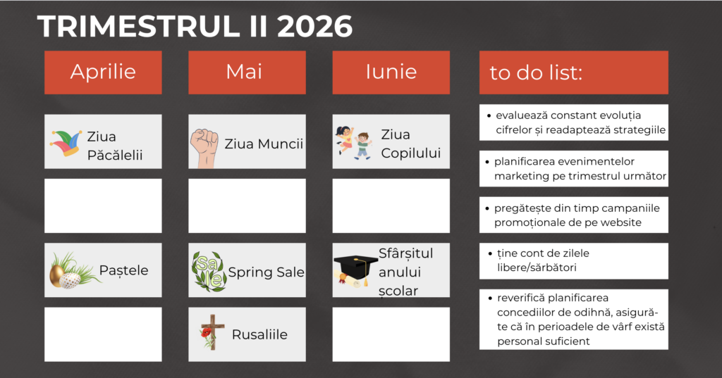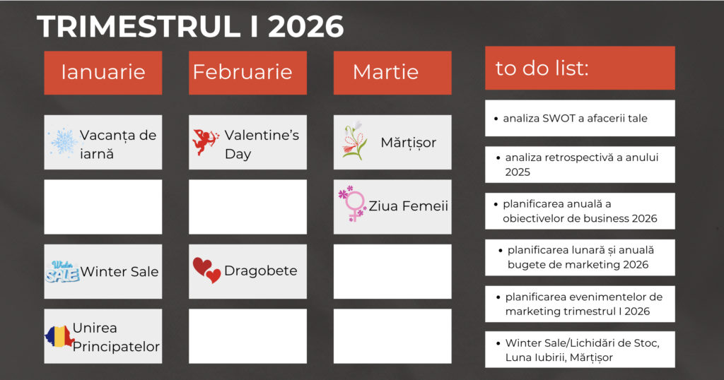 Analizează trecutul, stabilește obiective clare și creează un plan detaliat pentru a-ți atinge succesul în anul următor. În funcție de specificul afacerii tale, planifică-ți campaniile de marketing pentru primul trimestru în jurul evenimentelor importante precum Valentine’s Day, Dragobete și Ziua Femeii. Profită de aceste ocazii pentru a crea oferte speciale și a te conecta cu clienții tăi.