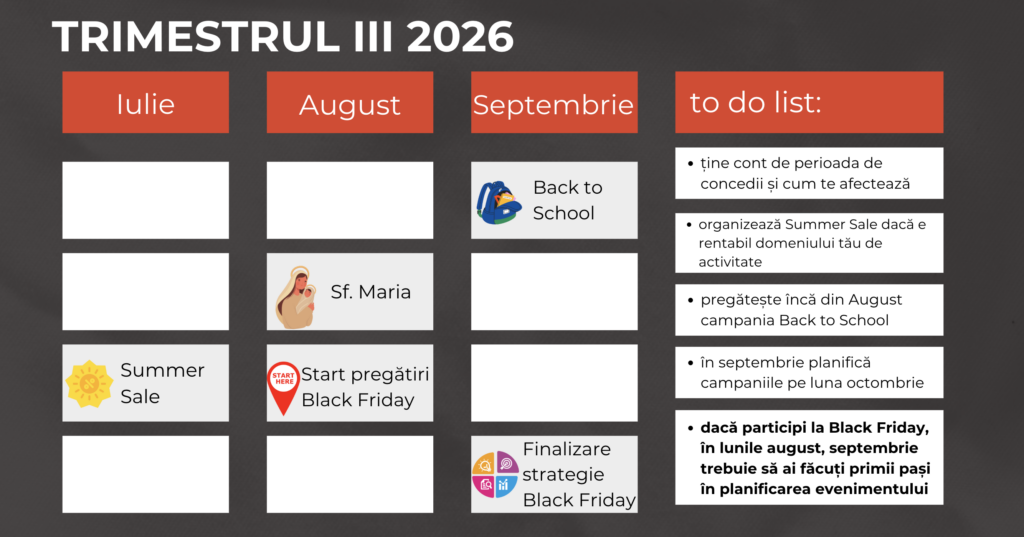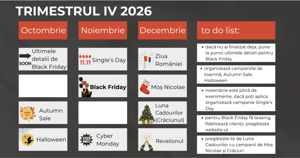 Tot de la începutul trimestrului ar fi ideal să poți planifica și promoțiile de sărbători, respectiv Christmas Sale, Winter Sale, sau cele specifice lunii noiembrie: Cyber Monday, Crazy Weekend. În tot acest timp ține cont de zilele libere dedicate sărbătorilor specifice sezonului, respectiv, 30 noiembrie, 1 decembrie, 25-26 decembrie.