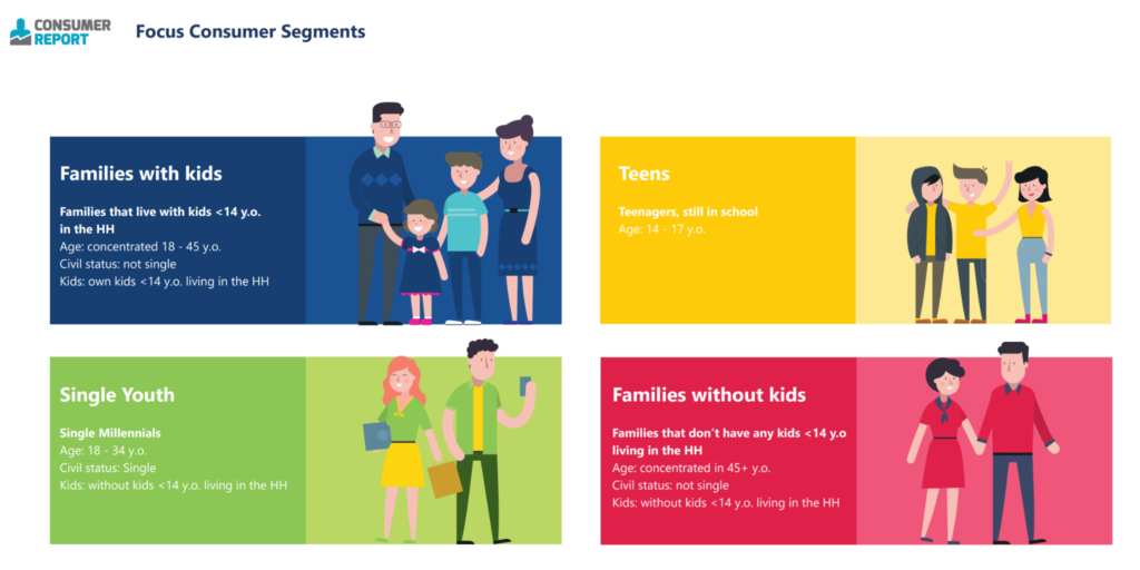- Familii cu copii („Families with kids”) – familii, majoritatea având vârsta cuprinsă între 18-45 ani, care au copii cu vârsta până în 14 ani;