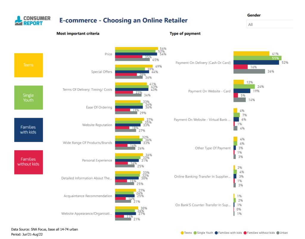 În ceea ce privește cumpărăturile online, criteriile principale care influențează luarea deciziei de achiziționare sunt următoarele: termenii de livrare și ușurința de a plasa comanda, în special pentru tinerii necăsătoriți și pentru familiile cu copii. Pe când reputația website-ului, aspectul/designul acestuia precum și experiența personală cu magazinul online, influențează decizia de cumpărare în rândul adolescenților.