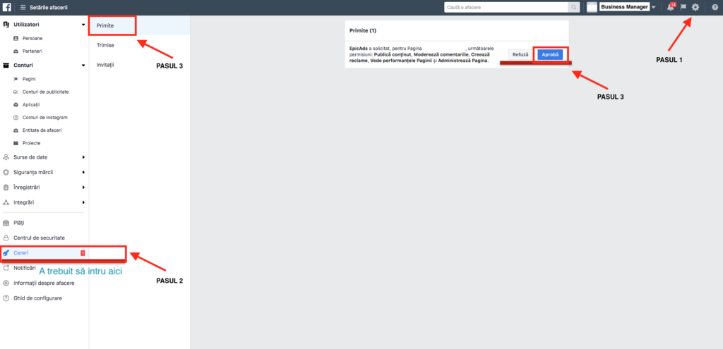 În contul de Business Manager se accesează setările afacerii (din colțul dreapta sus), iar apoi în meniul din stânga se accesează secțiunea Cereri.