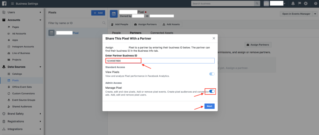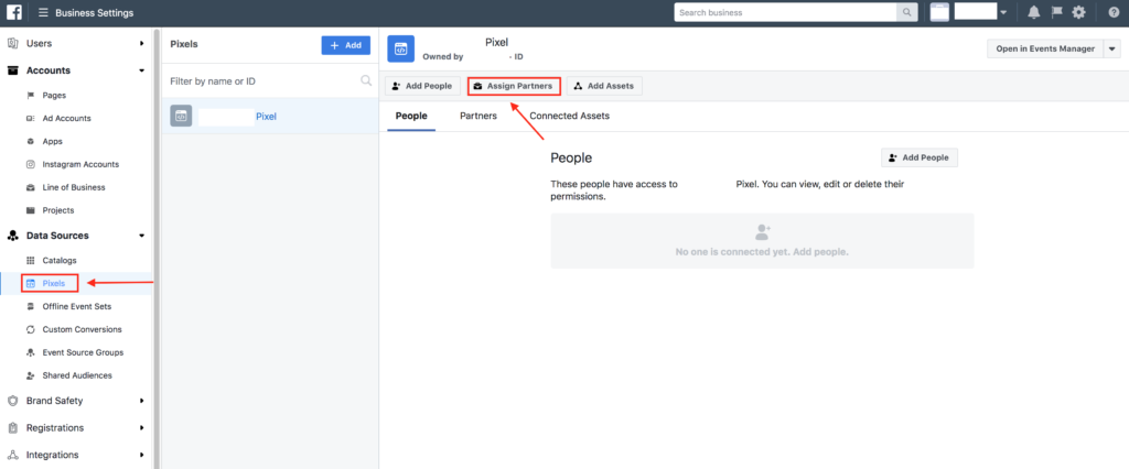 Pasul 2: La secțiunea Surse de date (în meniul din stânga) se accesează categoria Pixeli, iar mai apoi se apasă click pe Atribuie un partener (în partea de mijloc)