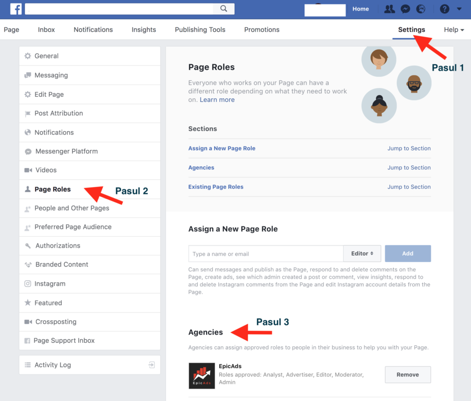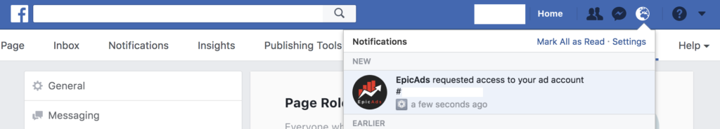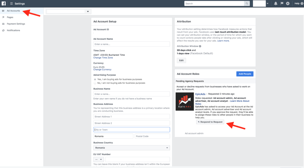 Pentru a conecta contul de publicitate aferent paginii de Facebook a afacerii dvs la contul agenției veți primi o invitație din partea acesteia. Aceasta trebuie aprobată urmând pașii de mai jos: